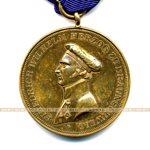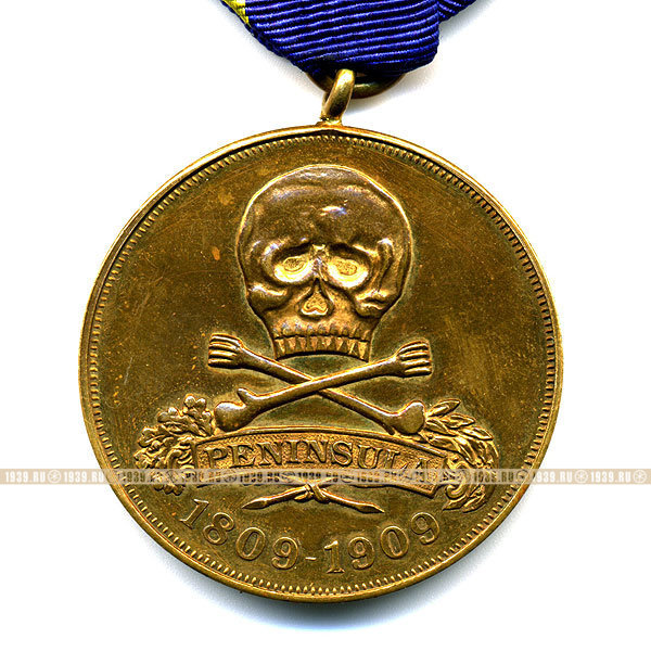 "Черные гусары Фридриха". Германия. Земля Брауншвейг. 100-летие битвы под Peninsula. Бронза, патина. 35мм. Штемпельный блеск. На оригинальной ленте. Эмблема в виде черепа - как символ презрения к своей смерти ради сохранения жизни других.