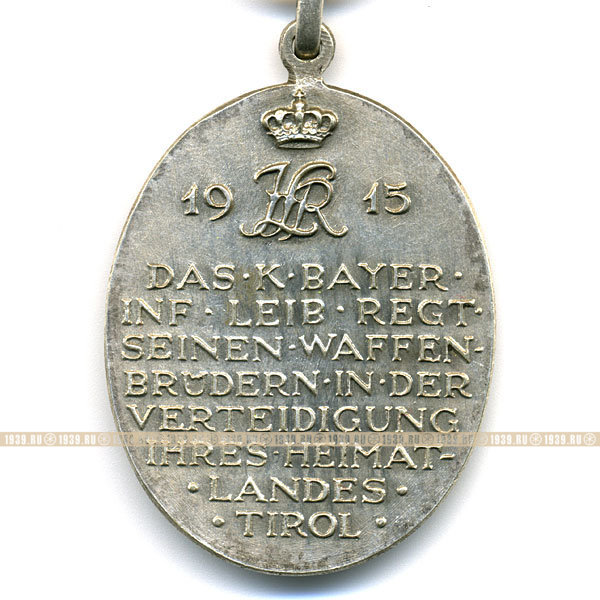 Медаль "В память активных боевых действий в Тироле, в 1915 году" В боях приняли участие баварские горные стрелки из Баварского пехотного полка лейбгвардии Кайзера. Бронза, серебрение, патина.