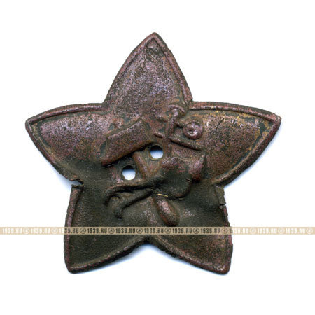 Звездочка на буденовку бойца РККА. Период Гражданской Войны 1918г. Самый первый вариант звёздочки на будённовку периода Гражданской войны. Одна из первых кокард Советской Республики: 29 июля 1918 года народный комиссар по военным делам Л. Троцкий утвердил приказ № 594, объявлявший для руководства описание и рисунок значка -кокарды для Рабоче-Крестьянской Красной Армии. Звезда с плугом и молотом являлась кокардой нового образца и была установлена за несколько месяцев до подписания 594го приказа. Сам 594й приказ был утвержден после того,как были учтены все дополнения рекомендованные Техническим Отделом Хозяйственного управления РККА ( РГВА, фонд 47, опись 20, лист 9), составлен детальный рисунок ( РГВА, фонд 47, опись 20, лист 47) и описание звезды утвержденное 19 июля 1918 года. Приложение к приказу НК № 594 от 29 июля 1918 года. Чертеж красноармейского значка-кокарды "Значок из желтой меди - штампованный, делается в форме слегка выпуклой пятиконечной звезды; края зубцов звезды слегка выгибаются наружу; посередине значка выштамповываются перекрещивающиеся плуг и молот; по очертанию краев звезда должна иметь выпуклый ободок. Значок с лицевой стороны, исключая плуг и молот, покрывается прочной красной лаковой краской, не отстающей от металла. На задней поверхности значка, в центре, припаивается вдвое сложенная медная пластинка, образующая двойную лапку, один конец которой несколько короче другого, и концы их срезаны наискось для удобства пригонки. Размеры у значка такие, что наружные концы звезды расположены по кругу диаметром 36 мм, а внутренние - по кругу диаметром 20 мм. Припаянная пластина шириной 4 мм, длинной 44мм.Сплав металла : меди 60 - 65% и цинка - 40 - 35%. Примесь других металлов допускается в количестве 1,1 /2%. Штампованные значки должны быть сделаны тщательно, правильно и по образцу. Вес 10 шт - не менее 6 золотников ( 27,73 грамм.).